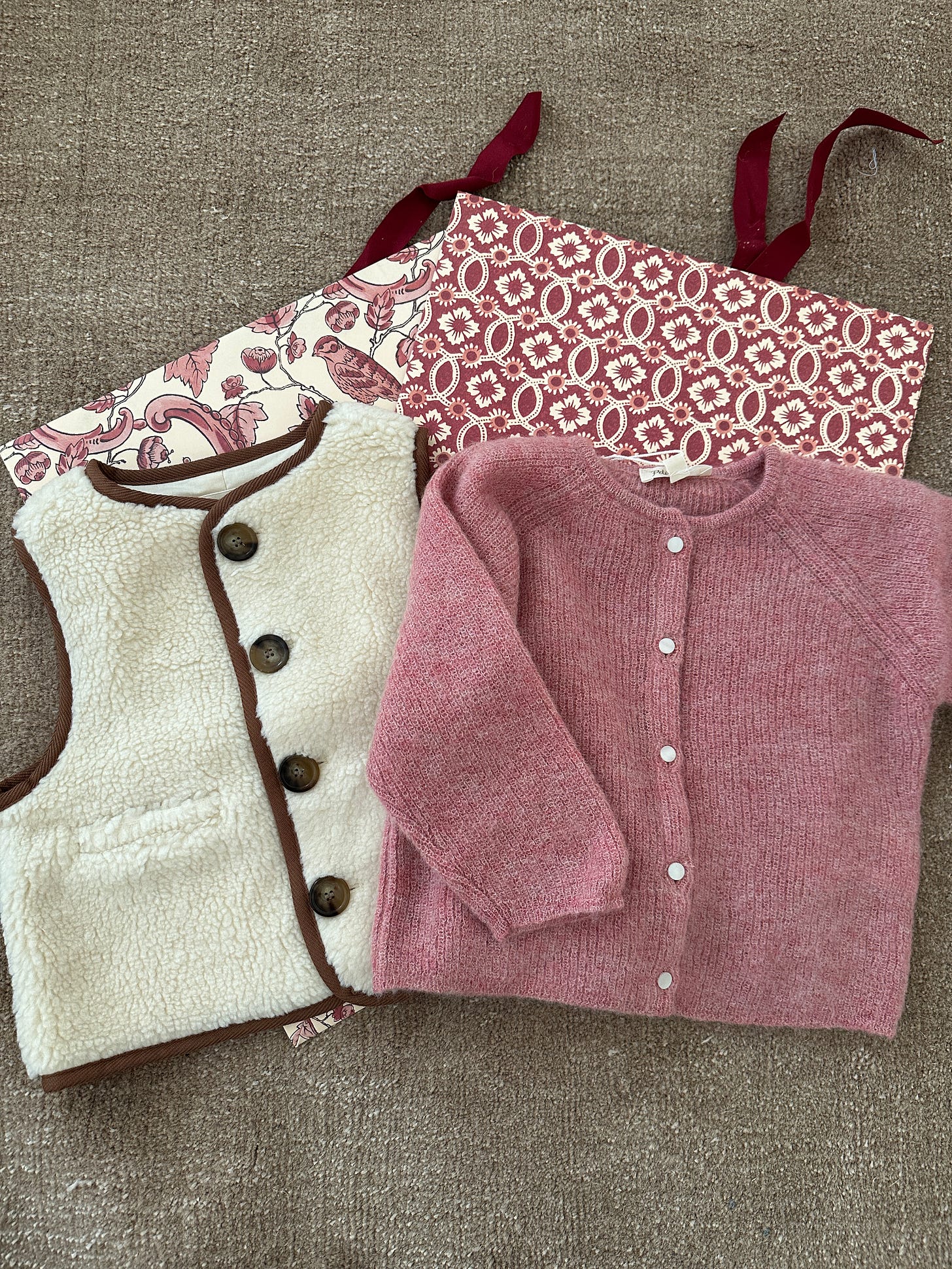I had to practically tear myself away from their darling kids’ collection, called “Petit Sézane.” I can’t get over this shearling vest I got for Lily. And yes, they’ve got mini-me sizes of some of their crowd-favorite sweaters, like a mini Gaspard cardigan. !
