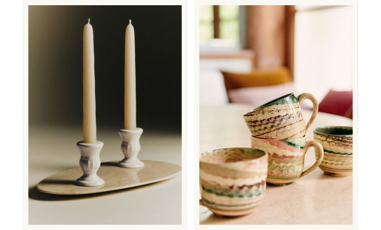 This glossy pitcher has the prettiest braided handle detail, and I’d be so happy to be gifted these pretty marbled mugs. I’d stock up on these tapered candles in gorgeous muted shades as a go-to hostess gift.